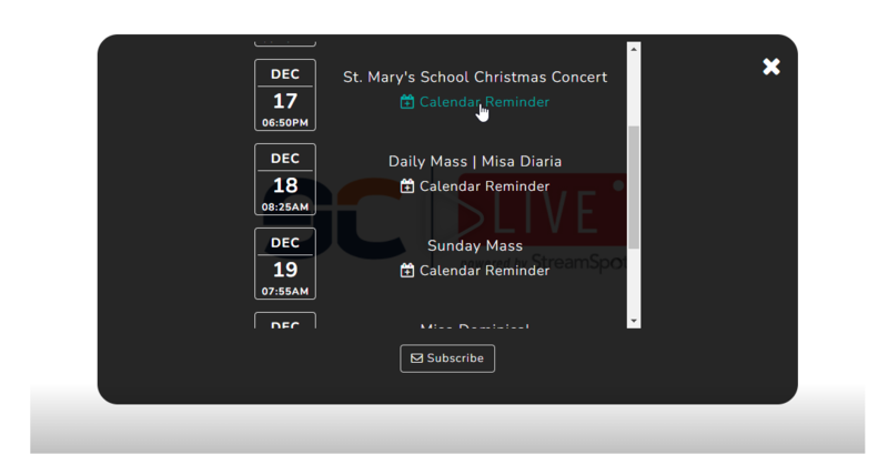 Due to the ongoing pandemic and the mandated protocols in place, only 2 adult guardians (parents) per family will be allowed in the church. This event will also be live-streamed, therefore, other family members may watch it online. They can see the event on the broadcast schedule player and set a calendar reminder on their device (see image below).